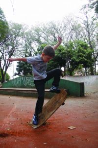 Caio diz que recentemente quebrou uma peça do skate novo, por isso está usando o já “surrado” que ganhou do vizinho, até que o outro seja consertado. “Não sou profissional, mas estou treinando e já consigo mandar ‘ollie’ e descer em algumas partes dessa pista”, mencionou, referindo-se à pista de skate situada na Praça Willy Barth.