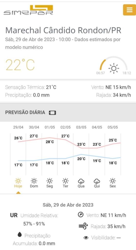 Em Marechal Cândido Rondon, o sábado amanheceu fresquinho e logo o sol começou a brilhar em um céu azul sem nuvens. No período da tarde, entre as faixas Oeste e Norte do Estado, esquenta um pouco mais, mas não chega a fazer calor.