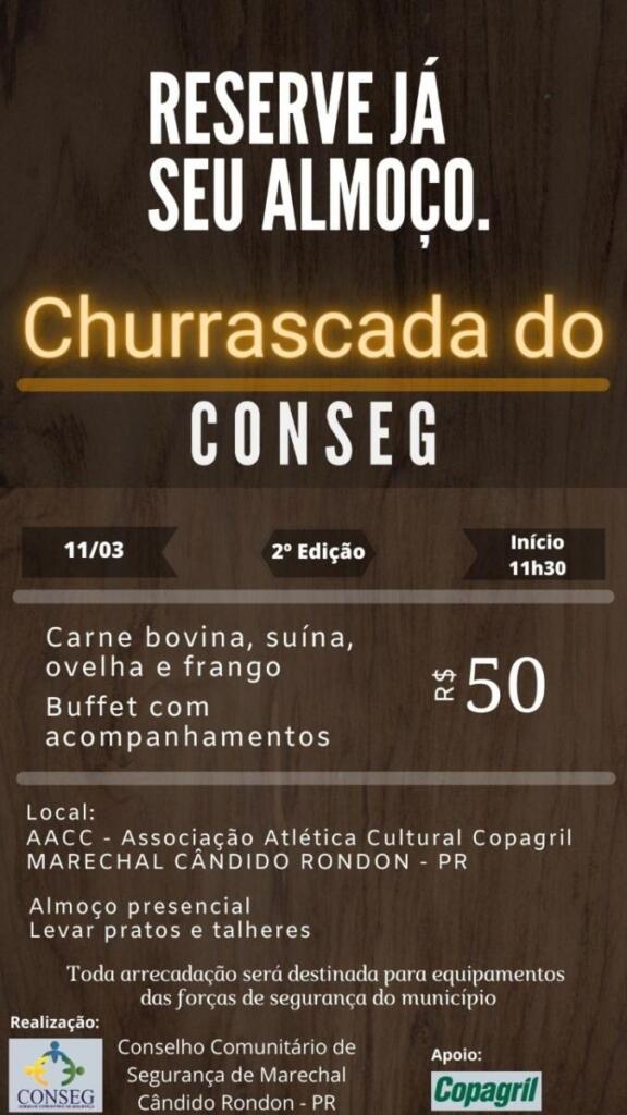O Conselho Comunitário de Segurança de Marechal Cândido Rondon (Conseg) iniciou a venda das fichas para a 2ª Churrascada, marcada para o dia 11 de março, nas dependências da AACC.