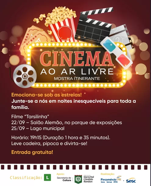 O Sesc, com o apoio da prefeitura de Marechal Cândido Rondon, por meio da Secretaria de Cultura, promove o Cinema ao Ar Livre para a comunidade, com a exibição do filme Tarsilinha.