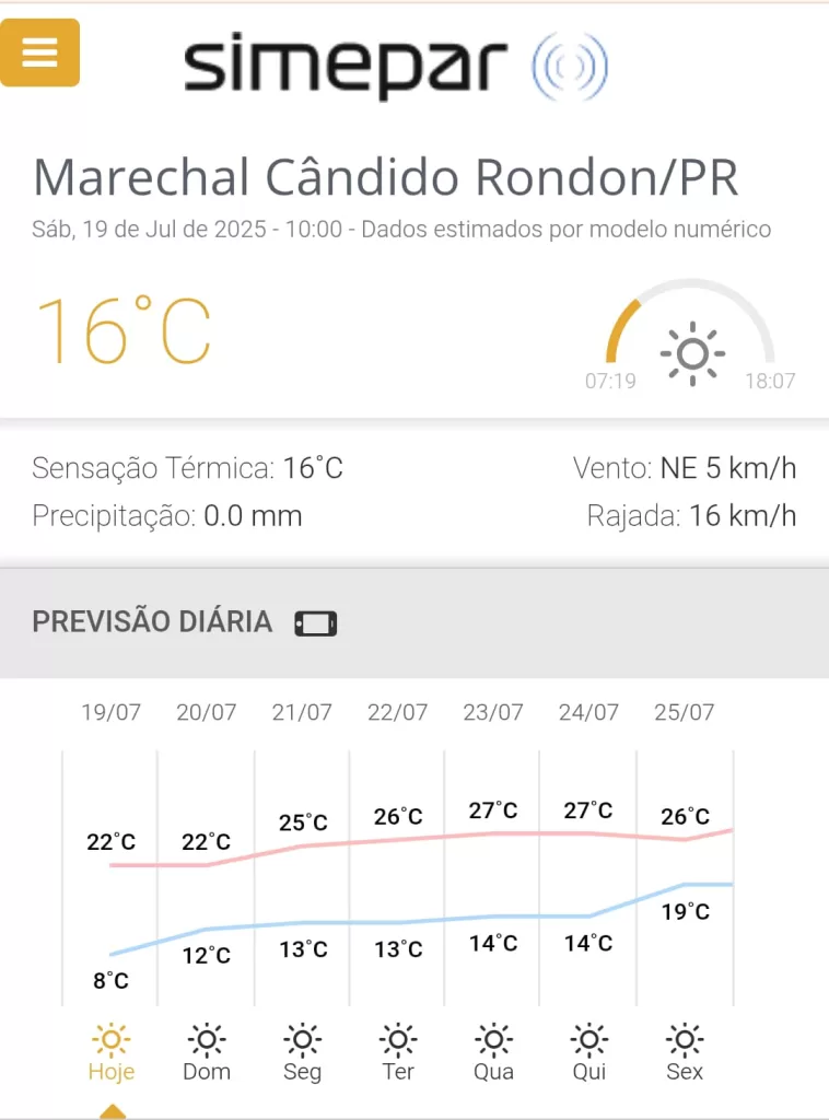 Em Marechal Cândido Rondon o sábado amanheceu com o céu limpo e termômetros na casa dos 7ºC. A temperatura máxima prevista para hoje é de 22ºC. Confira abaixo a previsão para os próximos dias.