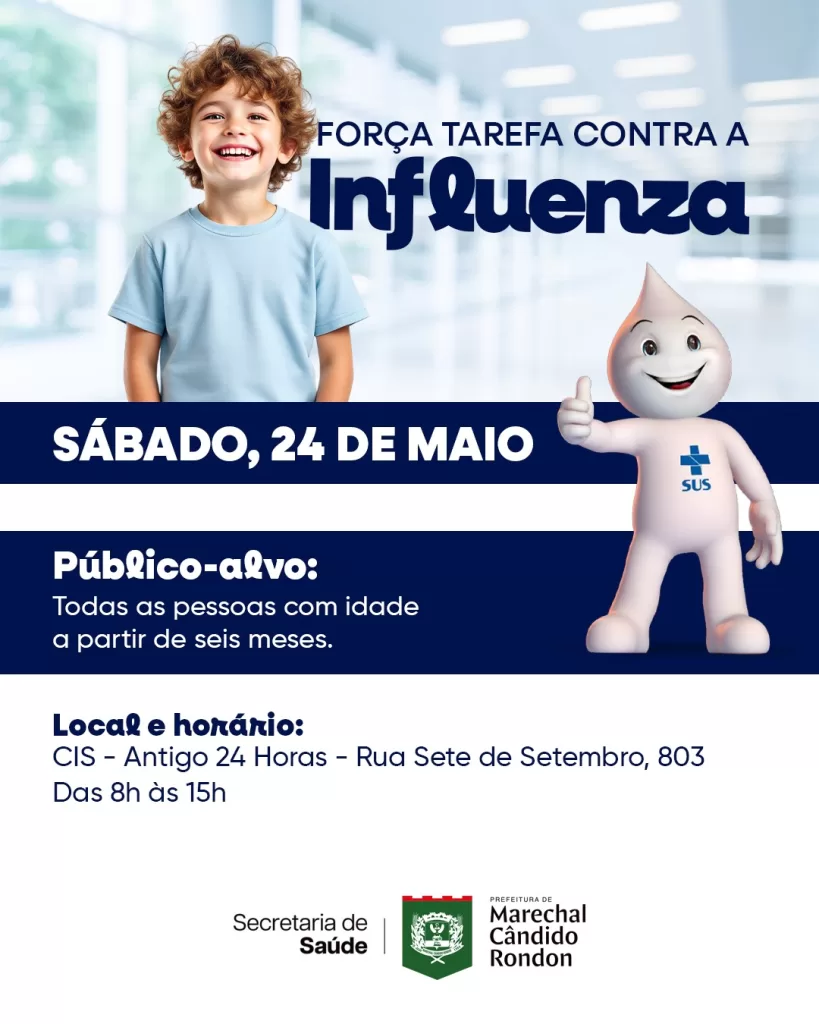 A prefeitura de Marechal Cândido Rondon, através da Secretaria de Saúde, reforça a importância da vacinação contra a influenza (gripe) para todas as pessoas a partir dos seis meses de idade.
