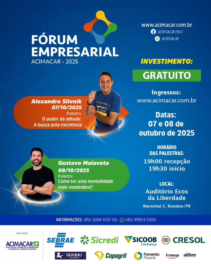 O Fórum Empresarial 2025 é promovido pela Acimacar em parceria com Sebrae PR, Sicredi Aliança PR/SP, Sicoob Confiança, Cresol Integração, Sooro Renner, Copagril, Fomento Paraná, Frimesa e Alibra Ingredientes.