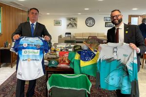 O secretário da Aquicultura e Pesca do Ministério da Agricultura, Pecuária e Abastecimento (Mapa), Jorge Seif Junior, que esteve há cerca de duas semanas em Marechal Rondon, foi quem entregou a camiseta ao presidente da República.