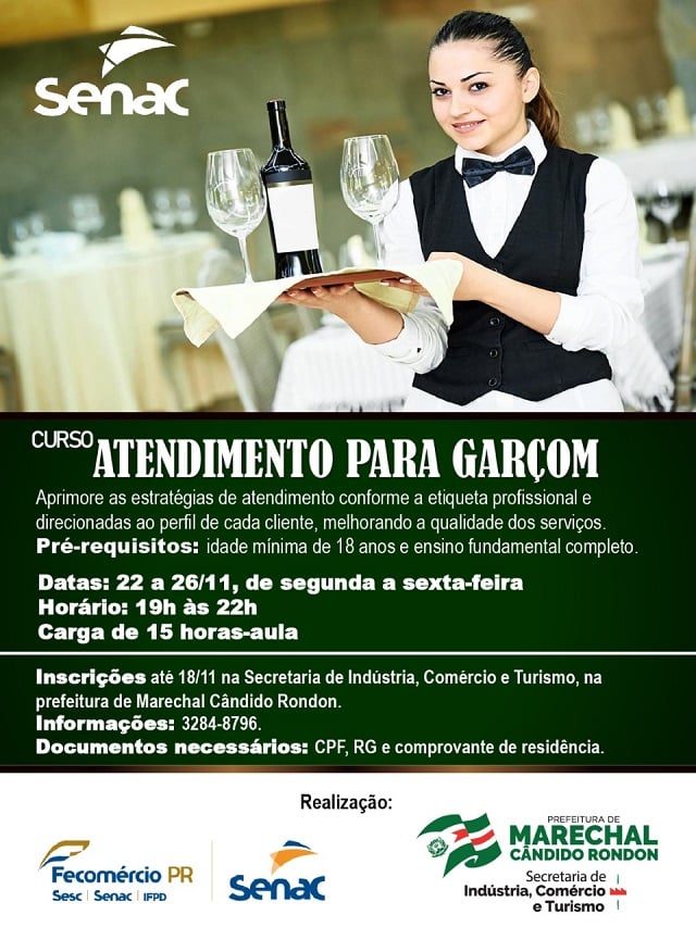 Permanecem abertas até quinta-feira (18), as matrículas aos garçons interessados em participara da capacitação sobre estratégias de atendimento conforme a etiqueta profissional e direcionadas ao perfil de cada cliente, melhorando a qualidade dos serviços.
