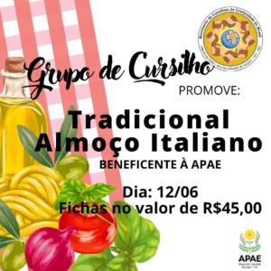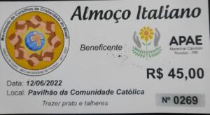 O Movimento de Cursilhos de Cristandade do Brasil, de Marechal Cândido Rondon, promove no domingo (12) o tradicional almoço italiano beneficente à Apae. O almoço será servido no pavilhão da Igreja Católica, somente para consumo no local.