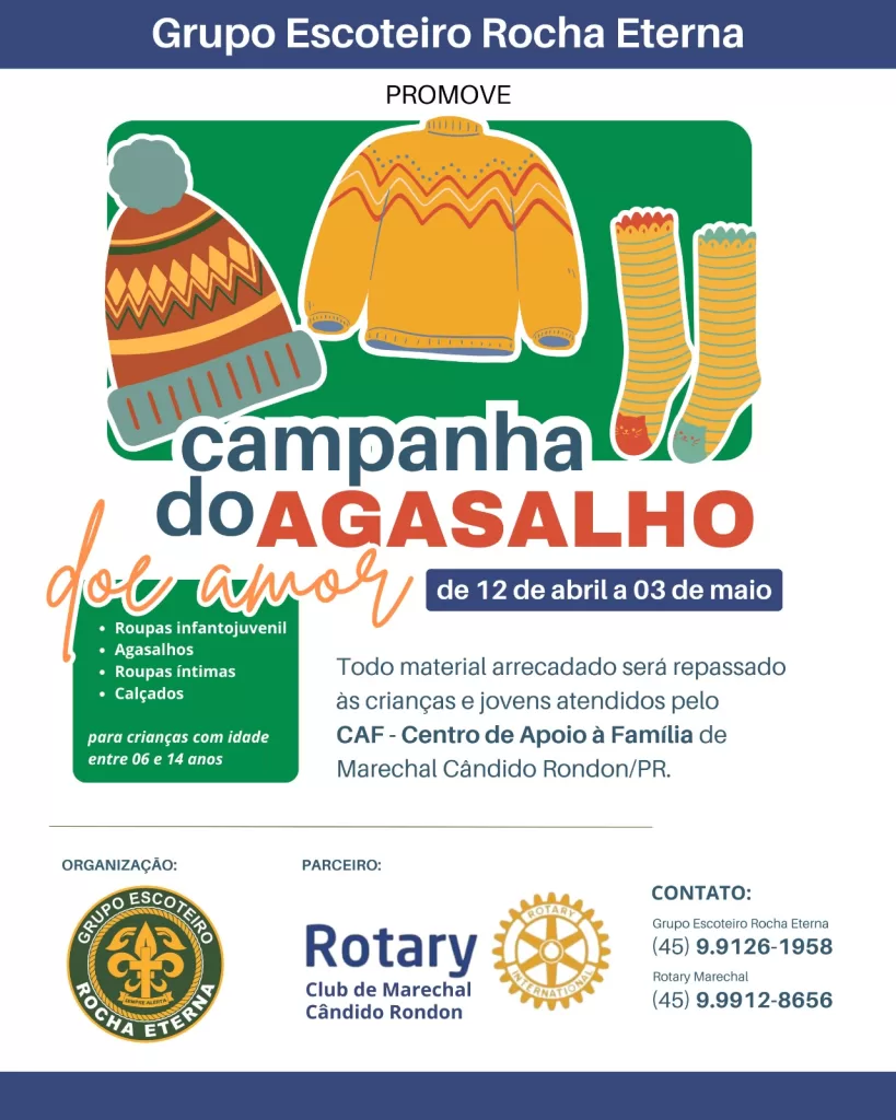 O Grupo Escoteiro Rocha Eterna, em parceria com o Rotary Club de Marechal Cândido Rondon, vai promover a “Campanha do Agasalho – Doe Amor!”, a fim de aquecer o inverno de muitas crianças.