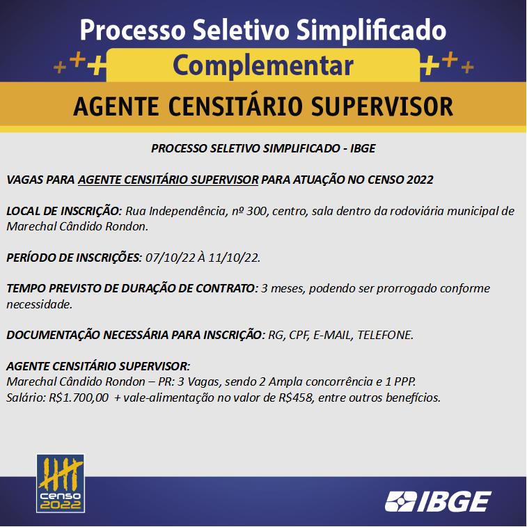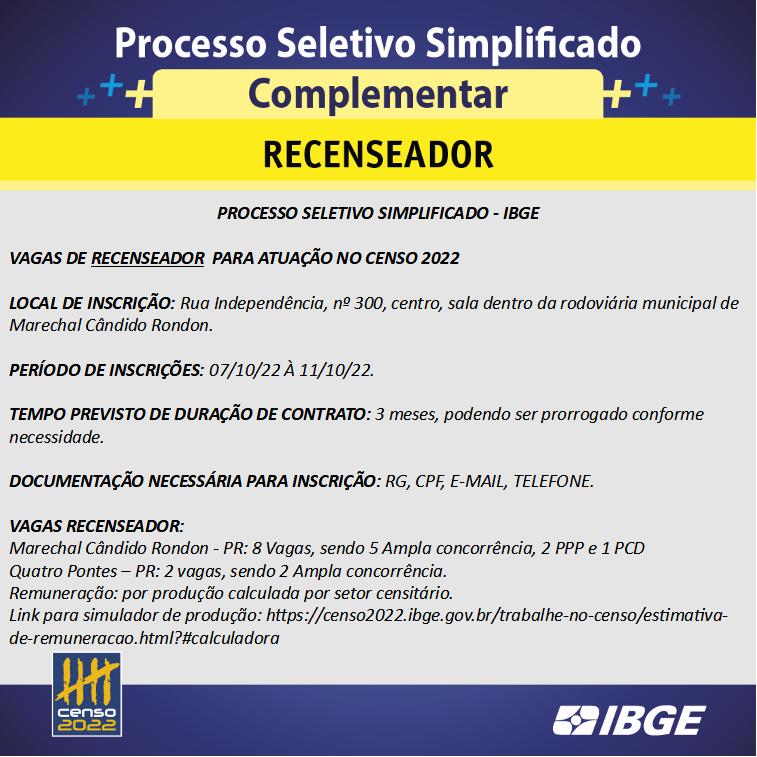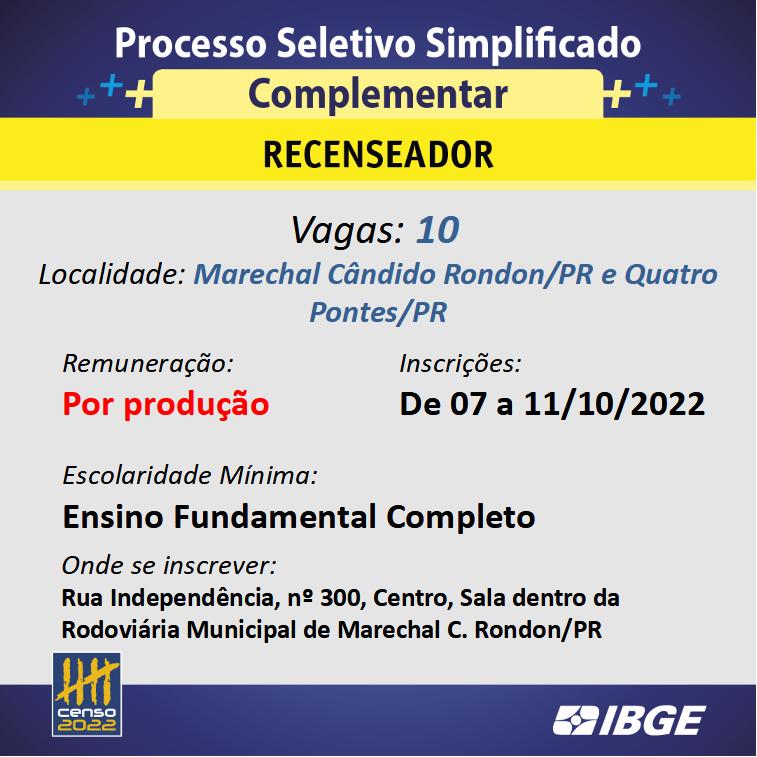 O Instituto Brasileiro de Geografia e Estatística (IBGE) abriu processo seletivo simplificado (PSS) complementar para contratação de agente censitário supervisor e recenseador com vagas para Marechal Cândido Rondon e Quatro Pontes.