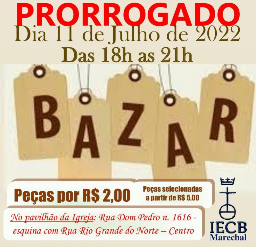 Devido ao grande movimento registrado no sábado (09), a 10ª edição do Bazar dos Trocados da Igreja Evangélica Congregacional do Brasil (IECB), em Marechal Cândido Rondon, será prorrogado. De acordo com a organização, interessados podem prestigiar a feira nesta segunda-feira (11), das 18 às 21 horas.