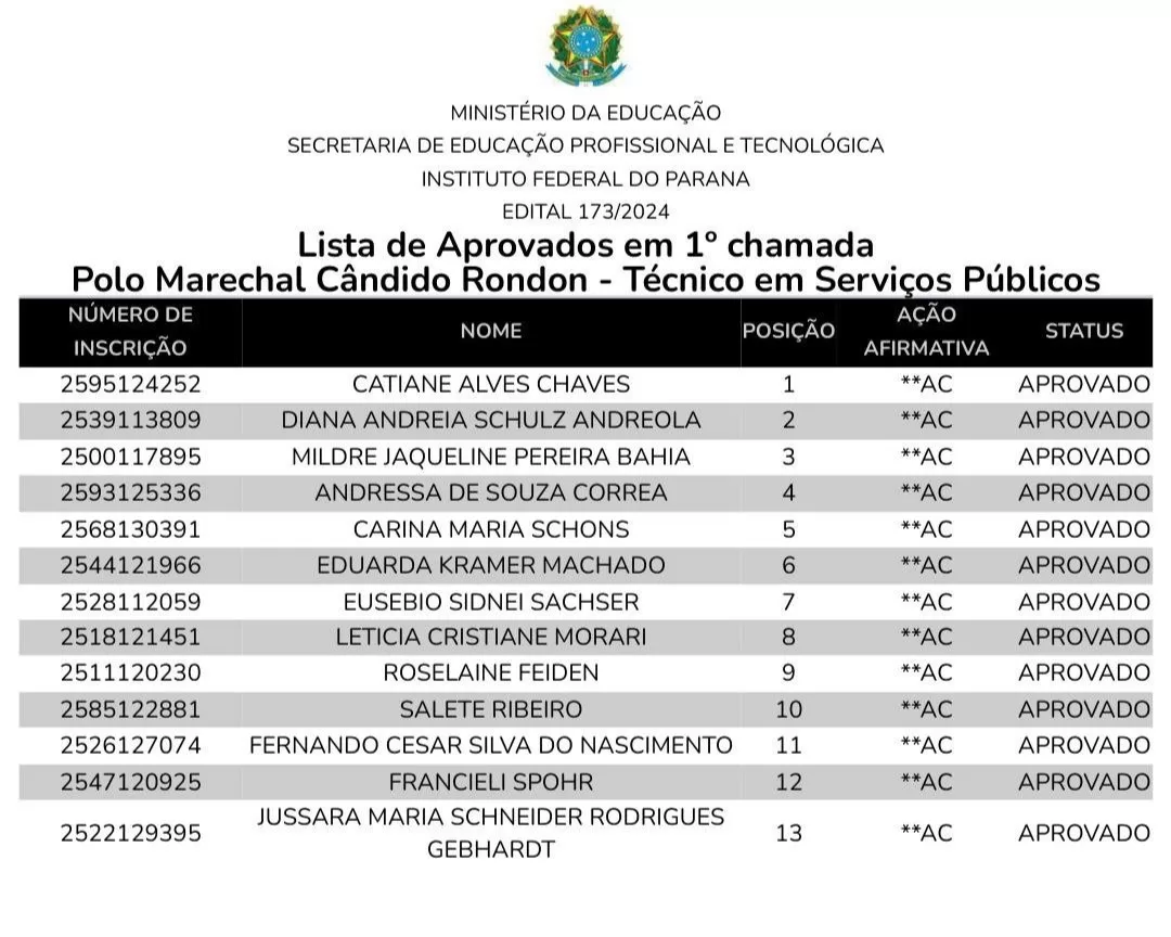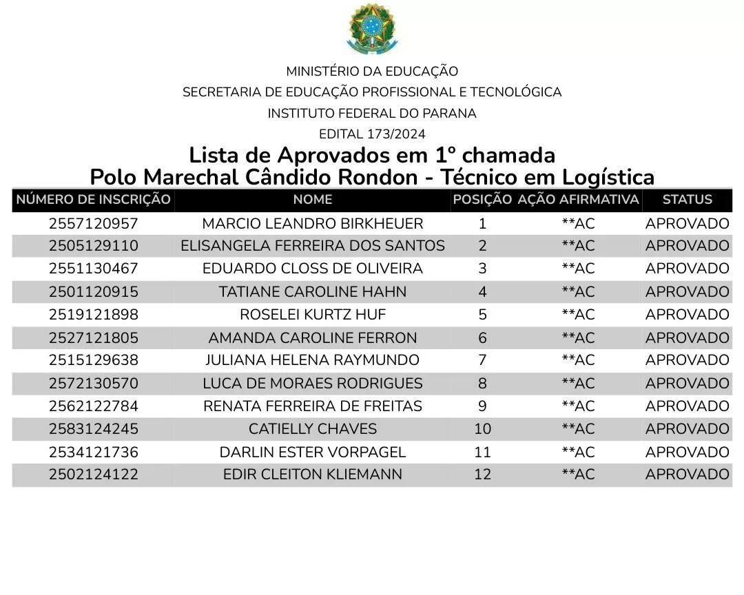 O Instituto Federal do Paraná (IFPR) divulgou a lista de candidatos aprovados no processo seletivo na modalidade de Educação a Distância (EaD) para o polo de Marechal Cândido Rondon.