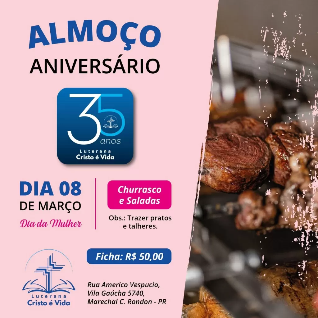 A Igreja Luterana Cristo É Vida, do bairro Vila Gaúcha, em Marechal Cândido Rondon, promove neste domingo (8) o tradicional almoço em comemoração ao 35º aniversário da comunidade religiosa e em celebração ao Dia Internacional da Mulher.