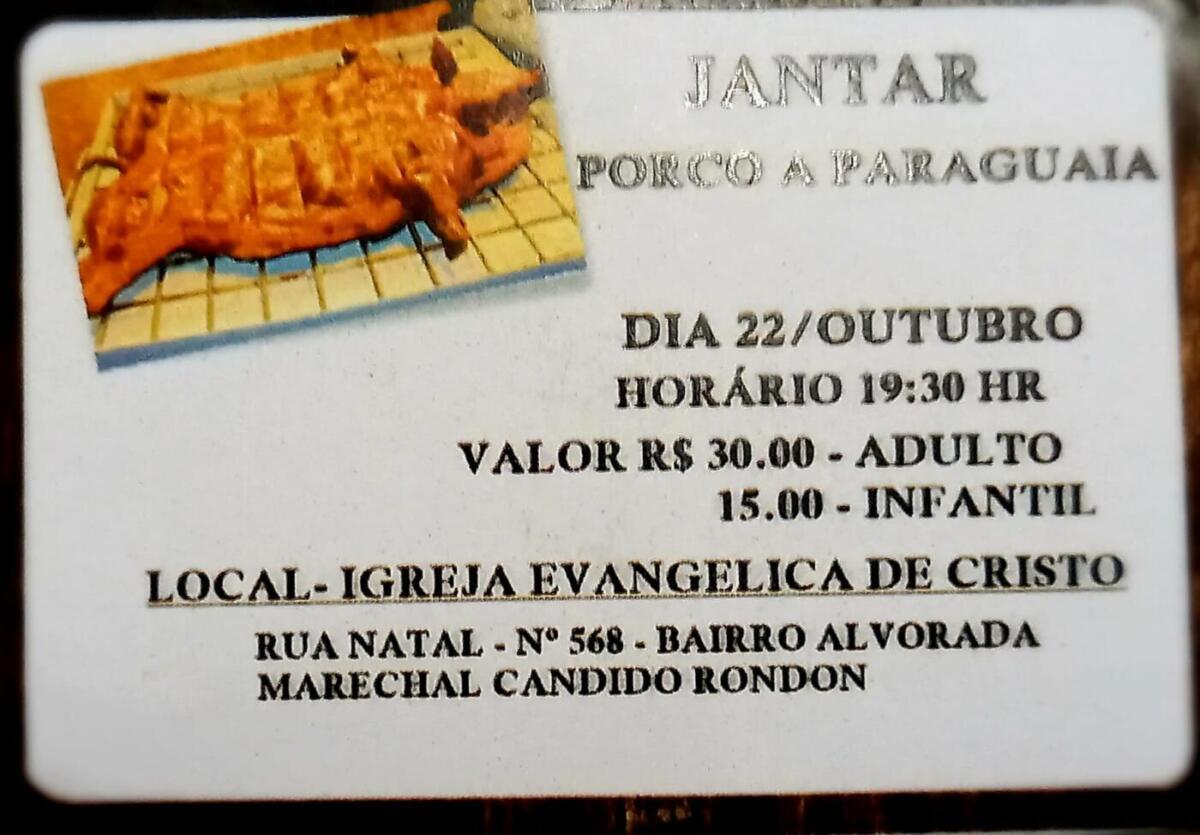 A Igreja Evangélica de Cristo, de Marechal Cândido Rondon, prepara um jantar à base de porco à paraguaia e à leitão à pururuca no próximo dia 22 de outubro, a partir das 19h30. Além dos pratos principais, haverá arroz, saladas diversas e pão.