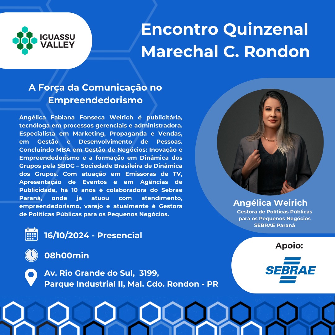 Nesta nova fase, a coordenação do Iguassu Valley.Rondon está sob a responsabilidade de Jhessica Leticia Bald, colaboradora do Itaipu Parquetec. O primeiro encontro desta retomada terá como tema “A Força da Comunicação no Empreendedorismo” e contará com a participação da consultora do Sebrae, Angélica Weirich.