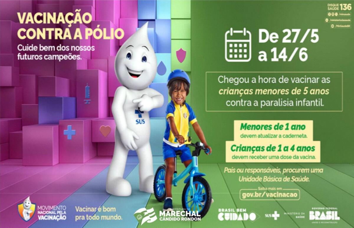 A Secretaria de Saúde de Marechal Cândido Rondon informa que inicia nesta segunda-feira (27), a campanha de vacinação contra poliomielite, que segue até o dia 14 de junho. A imunização, que é contra paralisia infantil, é destinada para crianças menores de cinco anos, sendo que crianças menores de um ano devem atualizar a caderneta e crianças de um ano a quatro anos 11 meses e 29 dias devem receber uma dose da vacina.