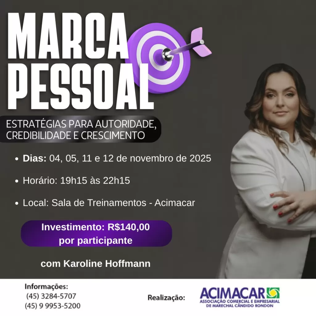Nos dias 04, 05, 11 e 12 de novembro, a Associação Comercial e Empresarial de Marechal Cândido Rondon (Acimacar) promove a capacitação “Marca pessoal: estratégias para autoridade, credibilidade e crescimento”. Em todas as datas, o curso acontece a partir das 19h15 na Sala de Treinamentos da entidade.