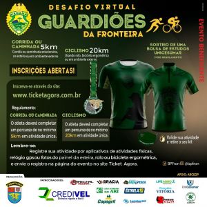 Em comemoração ao 9º aniversário do Batalhão de Polícia de Fronteira (BPFron), celebrado em 25 de julho, será realizado o 2° Desafio Guardiões da Fronteira, evento virtual que tem como objetivo integrar os diversos segmentos da sociedade à instituição Polícia Militar por meio da prática de atividade física, seja caminhada, corrida ou ciclismo. A ação é organizada pelo BPFron e conta com o apoio de diversas instituições e empresas.