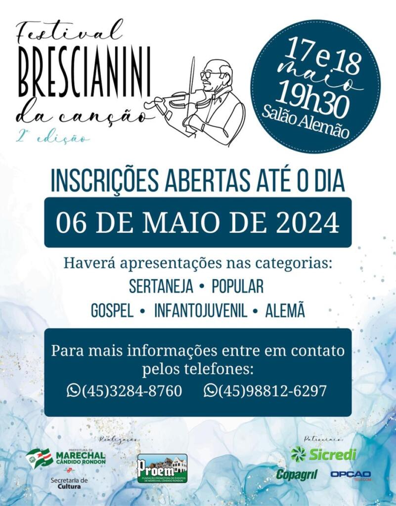 Prosseguem abertas até o dia 6 de maio, as inscrições ao 2º Festival Brescianini da Canção, agendado para os dias 17 e 18 de maio. O evento musical, de participação popular, ocorre com a finalidade de valorizar os artistas locais e regionais, além da difusão das músicas brasileira e alemã.