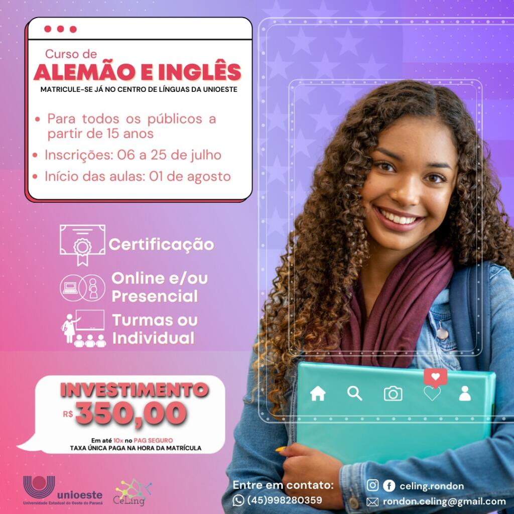 O Centro de Línguas de Marechal Cândido Rondon (CeLing), vinculado à Universidade Estadual do Oeste do Paraná (Unioeste), está com matrículas abertas para os cursos semestrais (40 horas) de alemão e inglês.