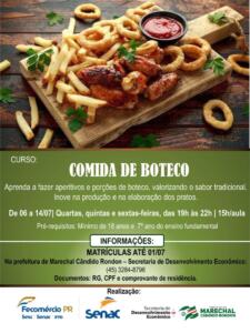 A prefeitura de Marechal Cândido Rondon, através da Secretaria de Desenvolvimento Econômico, e o Serviço Nacional de Aprendizagem Comercial (Senac), programam mais uma importante capacitação. Trata-se do curso no qual serão ensinadas técnicas para preparar comida de boteco, como aperitivos e porções. O objetivo é ensinar modos de inovar na produção e na elaboração dos pratos, preservando e valorizando o sabor tradicional dos alimentos servidos em bares e restaurantes.