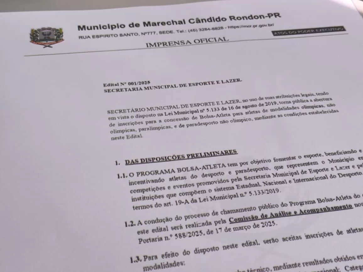 A prefeitura de Marechal Cândido Rondon, por meio da Secretaria de Esporte e Lazer, informa que estão abertas as inscrições para o Programa Bolsa-Atleta 2025.