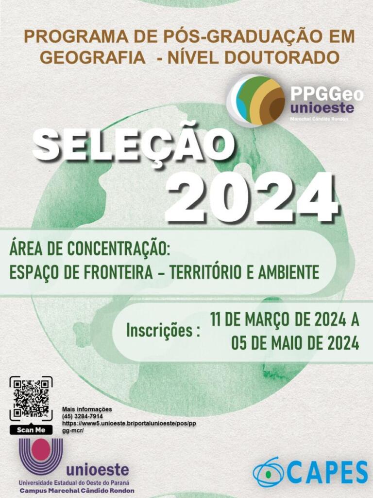 O Programa de Pós-graduação em Geografia – nível doutorado -, campus de Marechal Cândido Rondon da Universidade Estadual do Oeste do Paraná (Unioeste), está com inscrições abertas até domingo (5) para seleção de alunos.