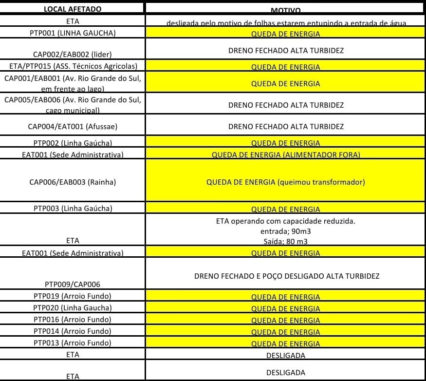 Até às 15 horas desta segunda-feira (9), o SAAE tinha 45% do abastecimento comprometido pelos ocorridos listados acima.