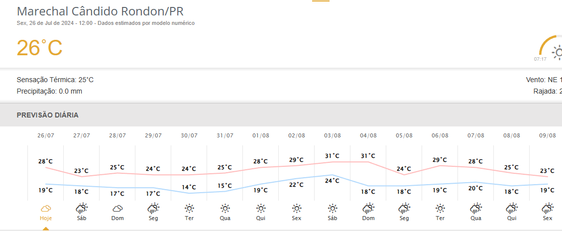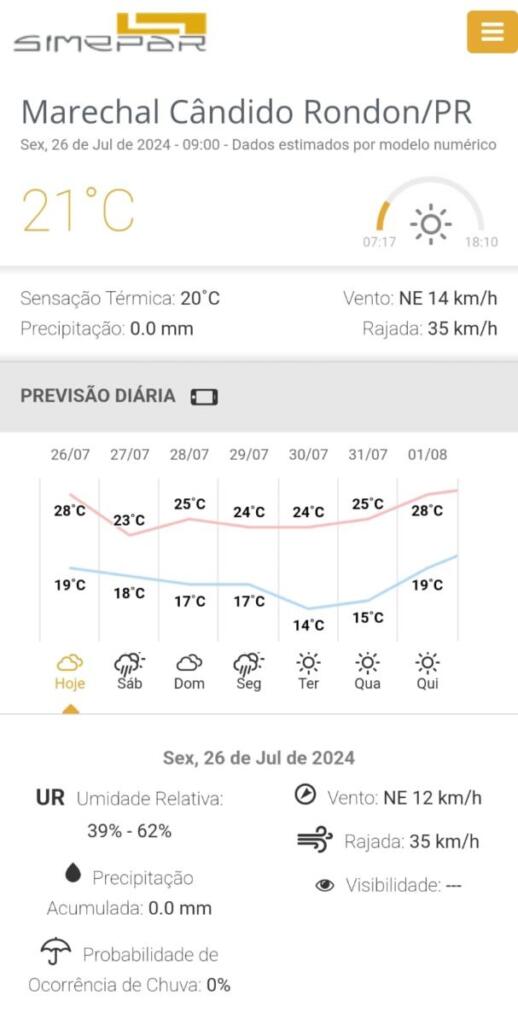 Confira a previsão do tempo para os próximos dias em Marechal Rondon, segundo o Simepar: