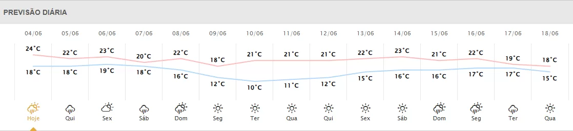 Toledo: Chuvas ocasionais e aumento da nebulosidade ao longo do dia. Mínima de 22°C e máxima de 17°C.
