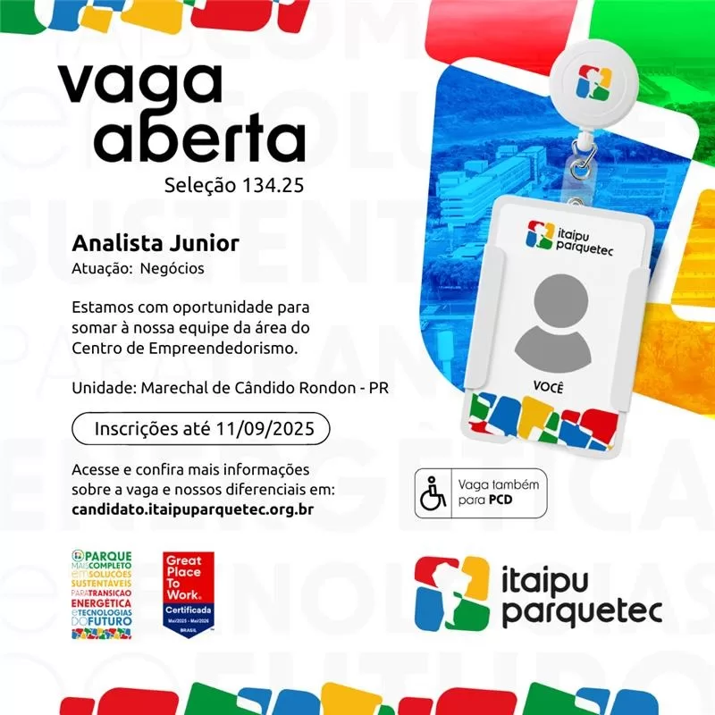 O Itaipu Parquetec, reconhecido polo de inovação e empreendedorismo vinculado à usina de Itaipu Binacional, está com vaga aberta para o cargo de Analista Júnior, com foco na área de Negócios. A oportunidade é para atuar no Centro de Empreendedorismo da instituição, localizado no município de Marechal Cândido Rondon.