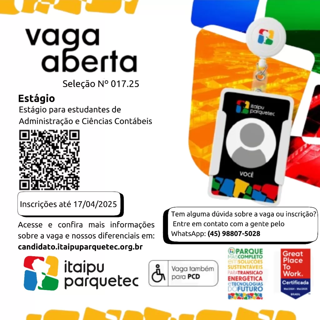 Interessados podem se inscrever até o dia 17 de abril, pelo link ? https://candidato.itaipuparquetec.org.br/vacancies/details.xhtml?viewState=DETAILING&id=799.