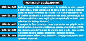 O workshop para os participantes do evento, que seria realizado no último dia 21, foi transferido para este sábado (04). A programação será desenvolvida na sede da entidade, localizada na Rua Presidente Costa e Silva, nº 1633. Na oportunidade, serão repassados aos interessados dicas, orientações e treinamento sobre técnicas de oratória e sobre o tema do concurso, que foi definido como “A coragem de fazer acontecer: como empreender seu próprio sonho”. As atividades iniciam às 09h15 e encerram às 16h15, com intervalo para o almoço.