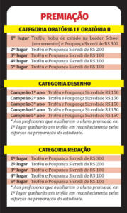 As inscrições para as categorias Oratória I e II, que englobam estudantes do Ensino Fundamental (8º e 9º ano) e Ensino Médio (do 1º ao 3º ano), encerraram ontem (30). Agora, cada escola precisará promover um processo seletivo interno, do qual escolherá um representante para concorrer na categoria “Oratória I” e/ou um representante para concorrer na categoria “Oratória II”, na etapa municipal.