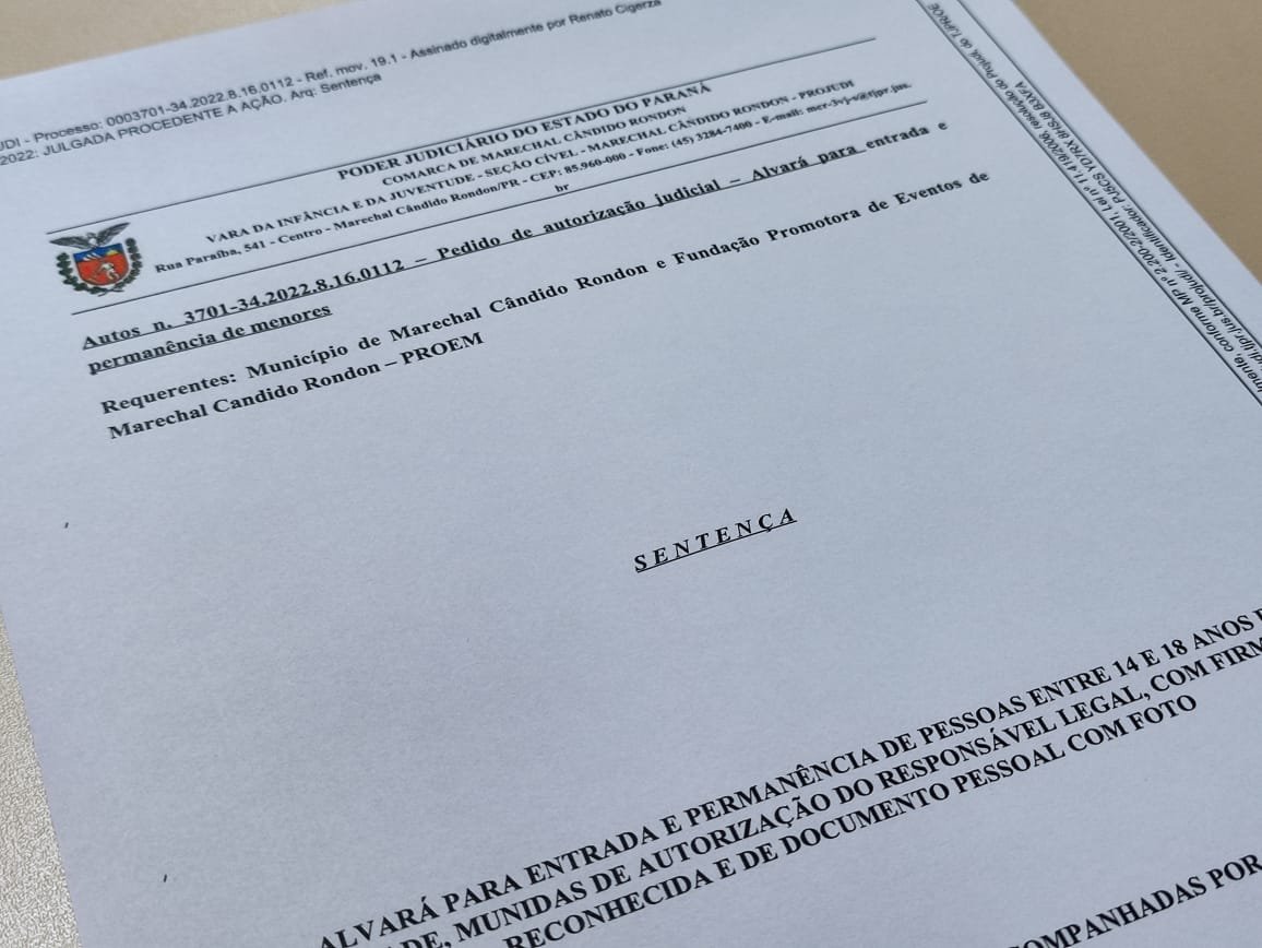 A prefeitura de Marechal Cândido Rondon e a Fundação Promotora de Eventos (Proem) encaminharam para a Vara da Infância e da Juventude pedido de autorização judicial para a entrada e permanência de menores de 18 anos no parque de exposições, durante a Expo Rondon 2022, que acontece de 21 a 25 de julho.