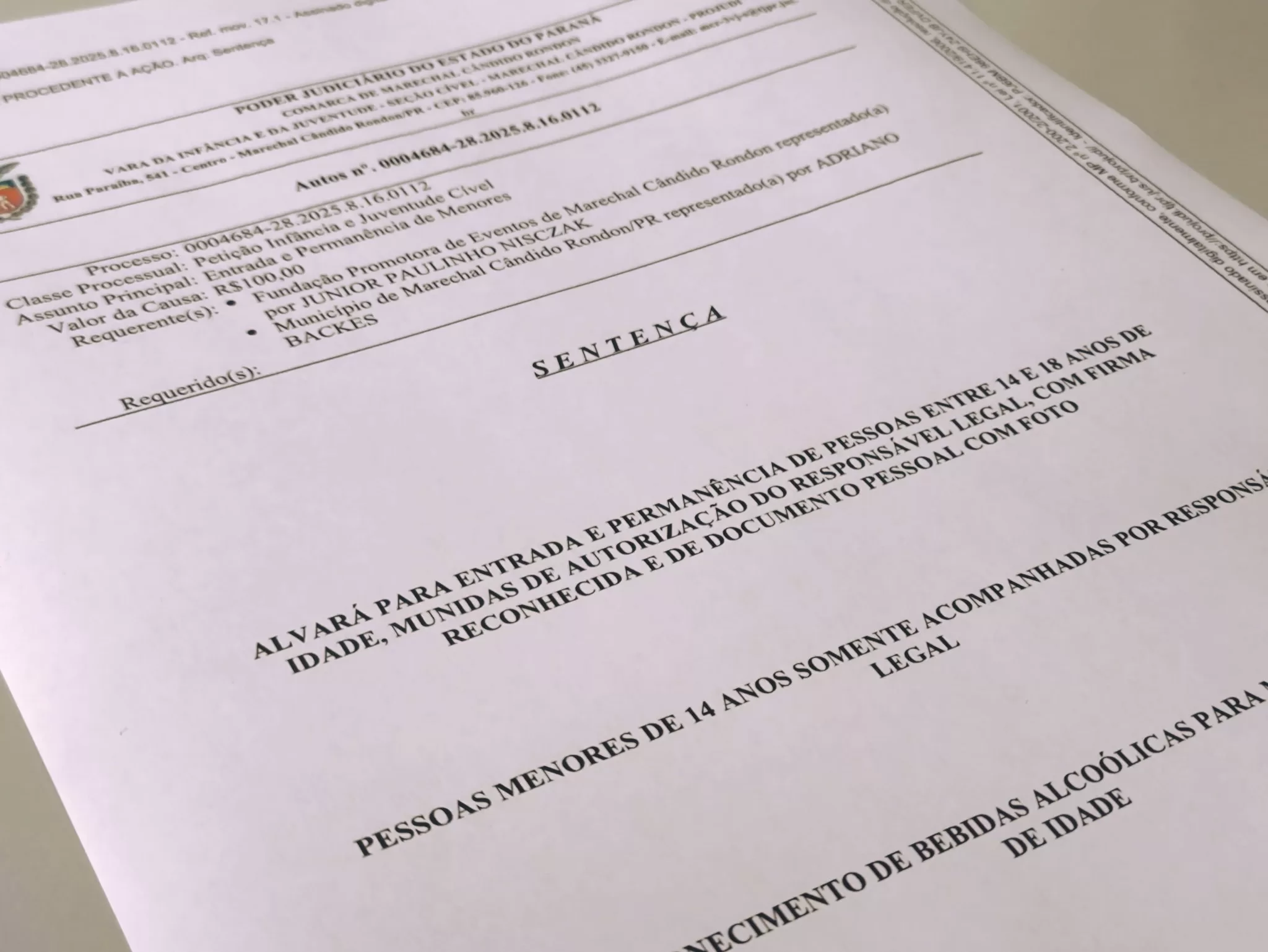 O juiz substituto na Seção Judiciária de Marechal Cândido Rondon, Eric Bortoletto Fontes, expediu sentença referente a pedido encaminhado pela prefeitura de Marechal Cândido Rondon e pela Fundação Promotora de Eventos (PROEM), para a Vara da Infância e da Juventude, referente à autorização judicial para a entrada e permanência de menores de 18 anos no parque de exposições, durante a Expo Rondon 2025, que acontecerá de 23 a 27 de julho.