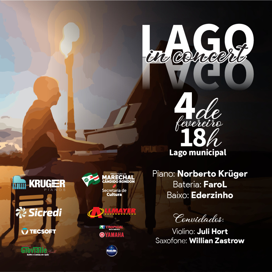 O evento é denominado de “Lago in Concert”, e contará com a presença dos artistas Norberto Krüger (piano), FaroL (bateria), Ederzinho (baixo), Juli Hort (violino) e Willian Zastrow (saxofone).