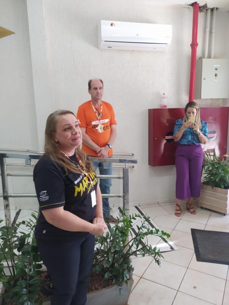 O grupo foi recebido pelo diretor do colégio, Ildemar Kanitz, que chamou Liane, momento em que foi informada ter sido escolhida a Funcionária Padrão 2022.