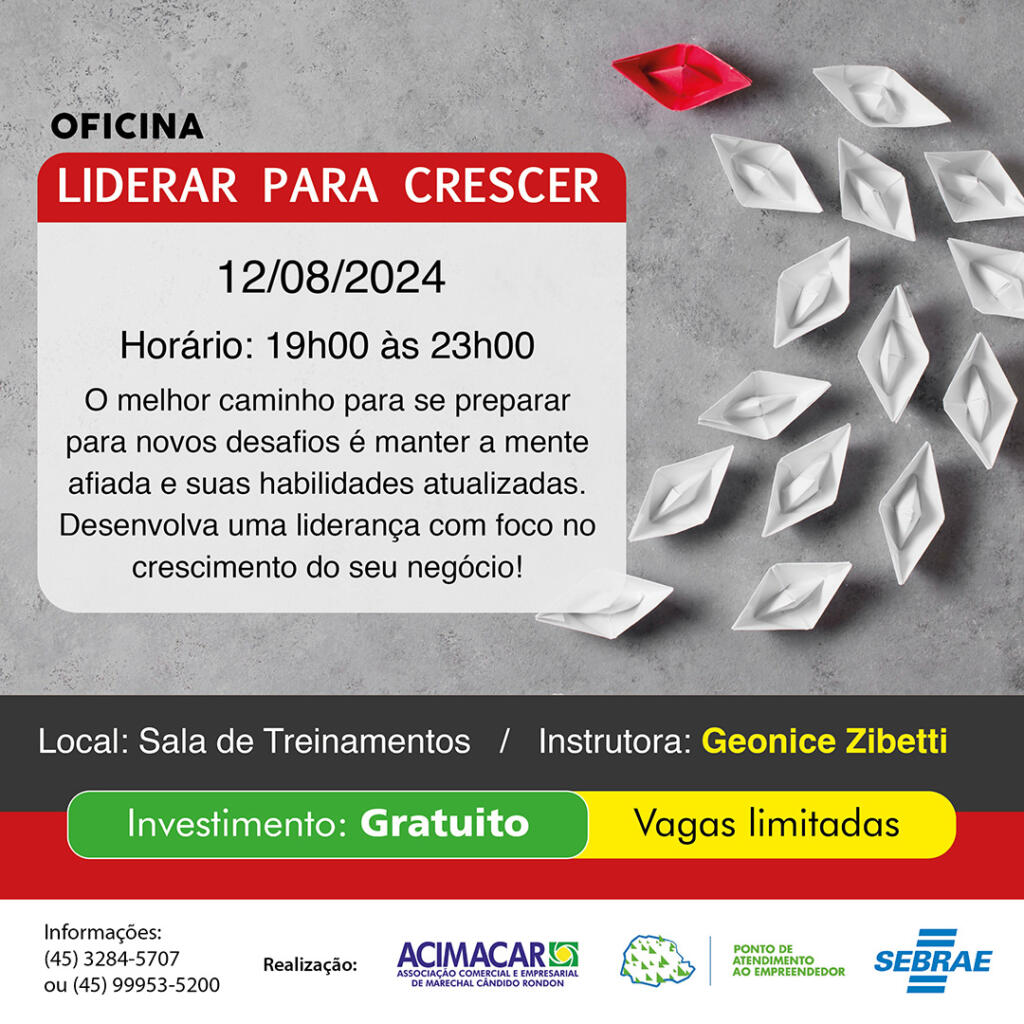 A Associação Comercial e Empresarial de Marechal Cândido Rondon (Acimacar) promove, na segunda-feira (12), uma oficina gratuita com o tema “Liderar para Crescer”.