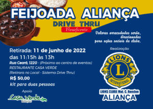 O Lions Clube Aliança, de Marechal Cândido Rondon, promove sábado (11) mais uma ação beneficente em prol dos projetos sociais do clube de serviço. Trata-se da Feijoada Aliança, no sistema drive-thru.