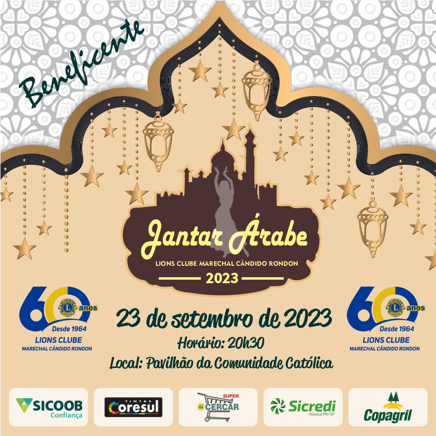 O Lions Clube Marechal Cândido Rondon promove no dia 23 de setembro a 42ª edição do seu tradicional jantar árabe.
