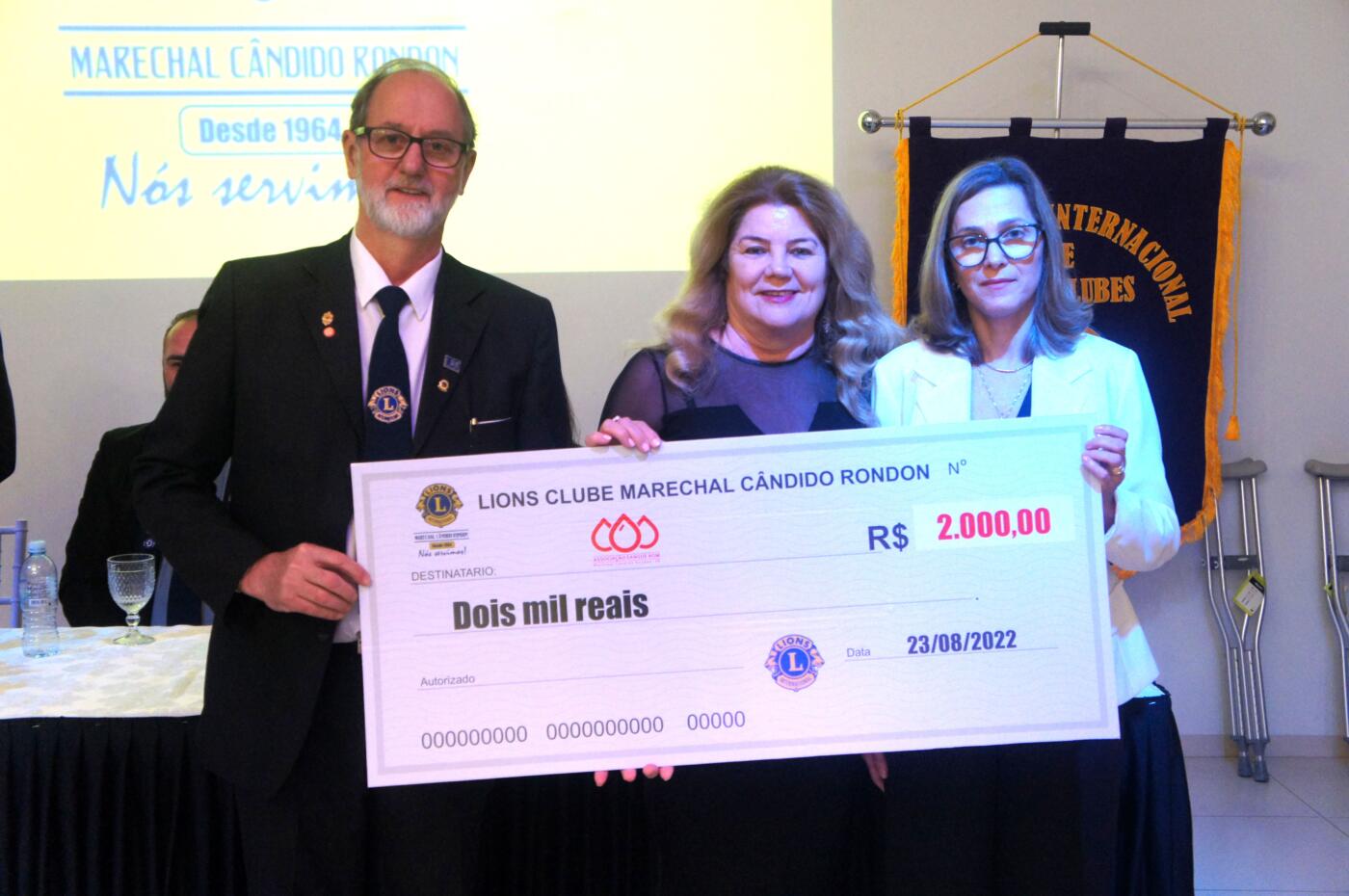 Foi repassado para o presidente da Associação Sangue Bom, Wilmar Güttges, e sua esposa Cleci, um cheque no valor de R$ 2 mil para manutenção do trabalho realizado pela associação.