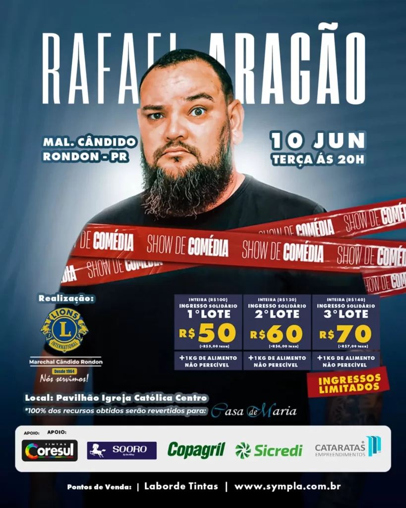 O Lions Clube Marechal Cândido Rondon traz para Marechal Rondon no dia 10 de junho, a partir das 20h, no Pavilhão da Comunidade Católica Centro o show do humorista Rafael Aragão – Tô de Escala.