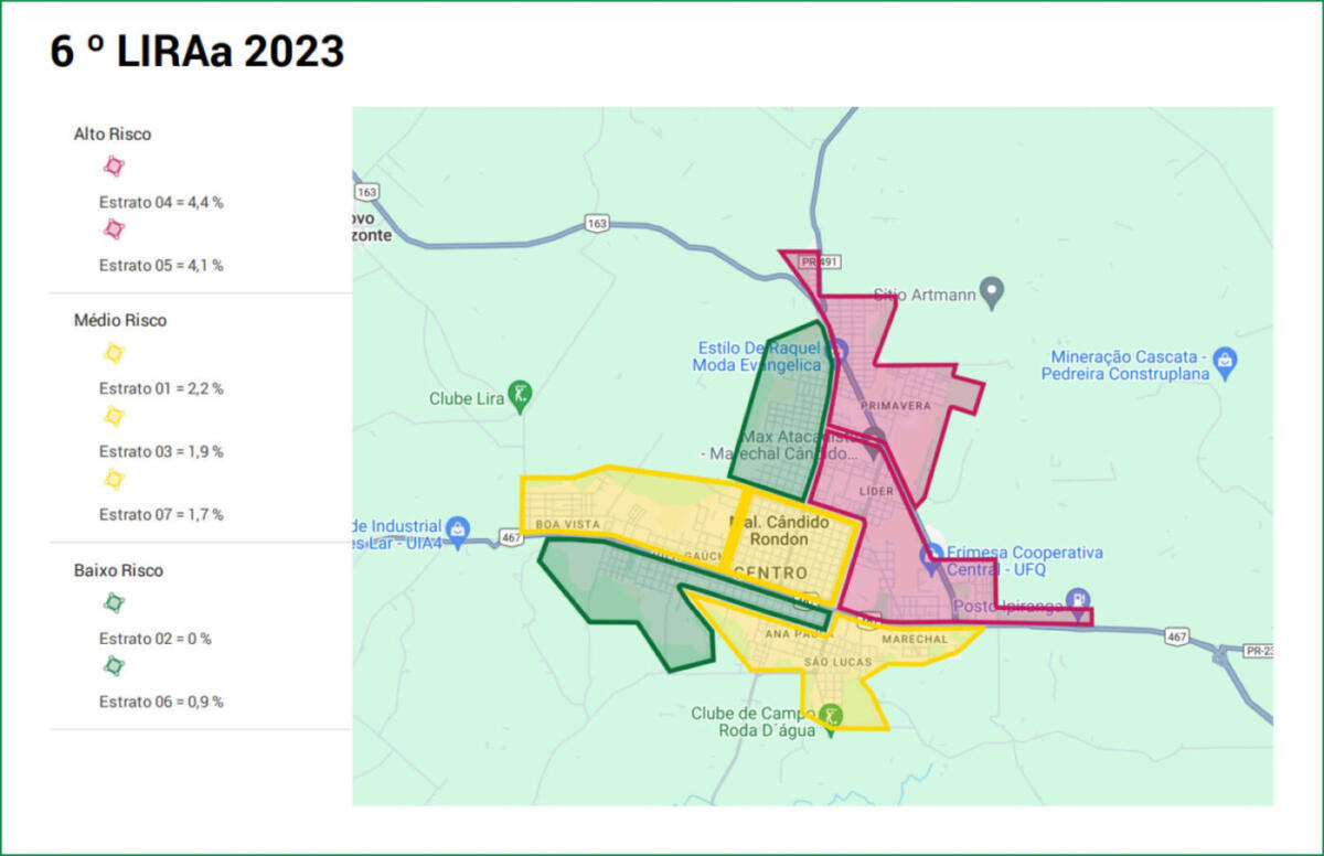 A Secretaria de Saúde de Marechal Cândido Rondon, por meio do setor de Endemias, divulgou nesta semana o Levantamento Rápido de Índices para Aedes aegypti (LIRAa), realizado no mês de novembro. O município apresentou média de 2,1% de infestação pelo mosquito transmissor da dengue, com base em sete estratos (regiões), muito superior ao índice preconizado pelo Ministério da Saúde, que é inferior a 1%.