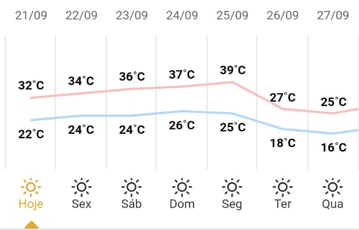 A previsão para Cascavel é de termômetros variando entre 19°C a 34°C, ventos de 39km/h e umidade do ar entre 32% e 85%.