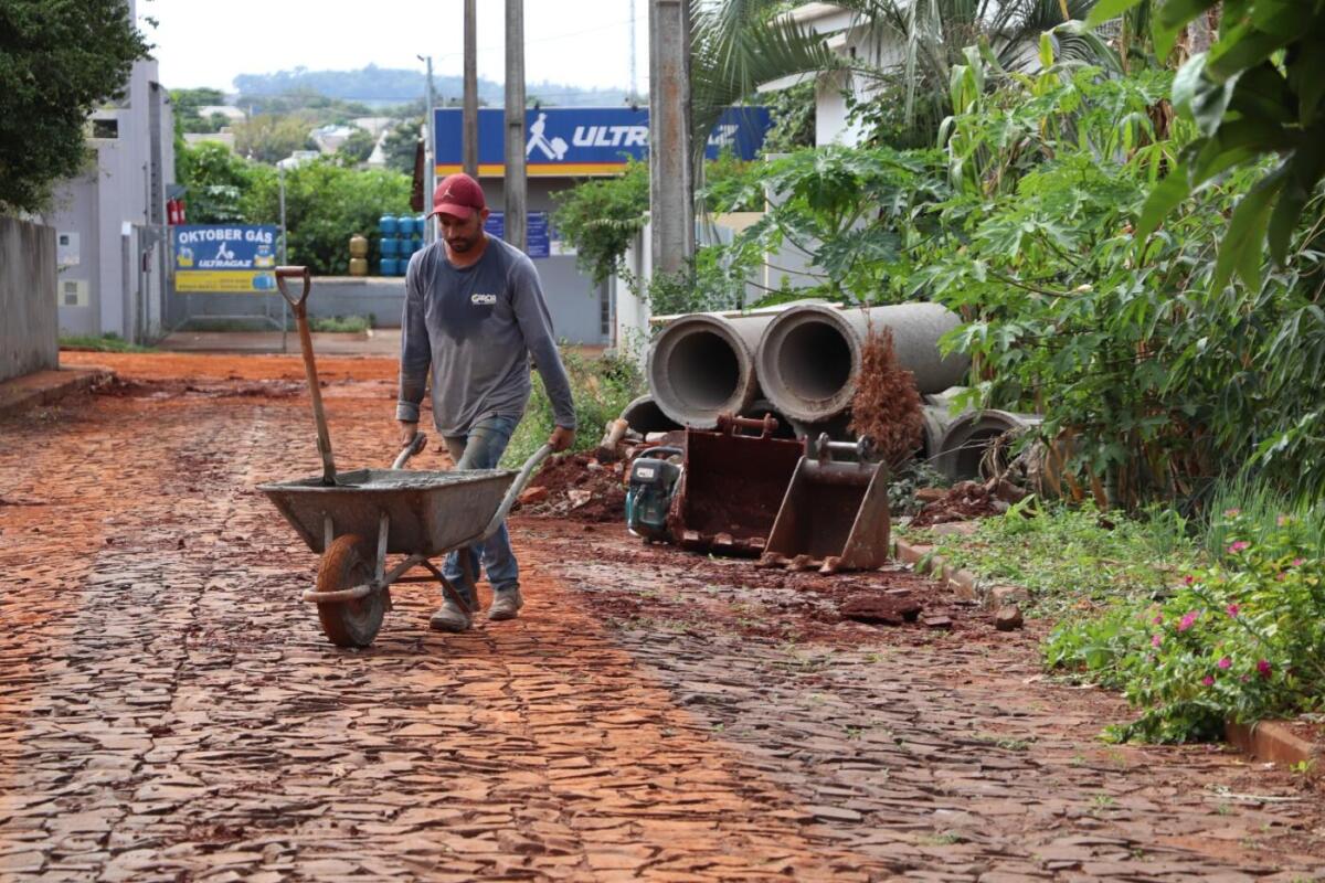 Inicialmente os serviços estão concentrados na implantação de galerias de água pluvial e, na sequência, os trechos serão preparados para receber o recape asfáltico sobre pedras irregulares.