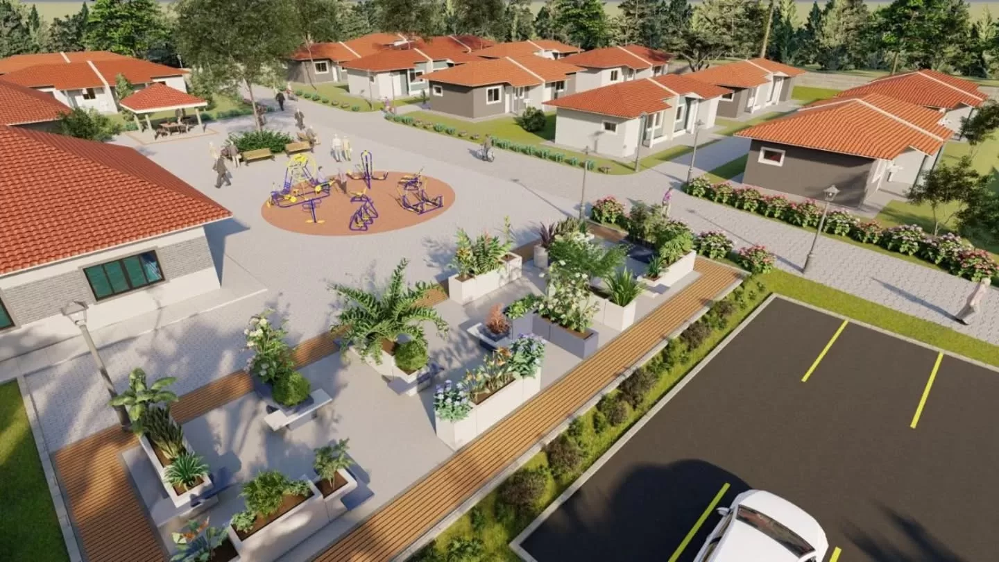 O condomínio fechado contará com uma estrutura completa para o bem-estar dos moradores, incluindo centro de convivência, ambulatório, academia ao ar livre, salão de festas, quiosques de jogos, espaço para fisioterapia, piscina coberta e aquecida para hidroginástica, biblioteca, guarita e estacionamento. Serão construídas 40 casas populares de 40m², todas adaptadas para idosos. Cada unidade contará com um quarto, sala, cozinha, banheiro e área de serviço externa, com capacidade para abrigar duas pessoas.