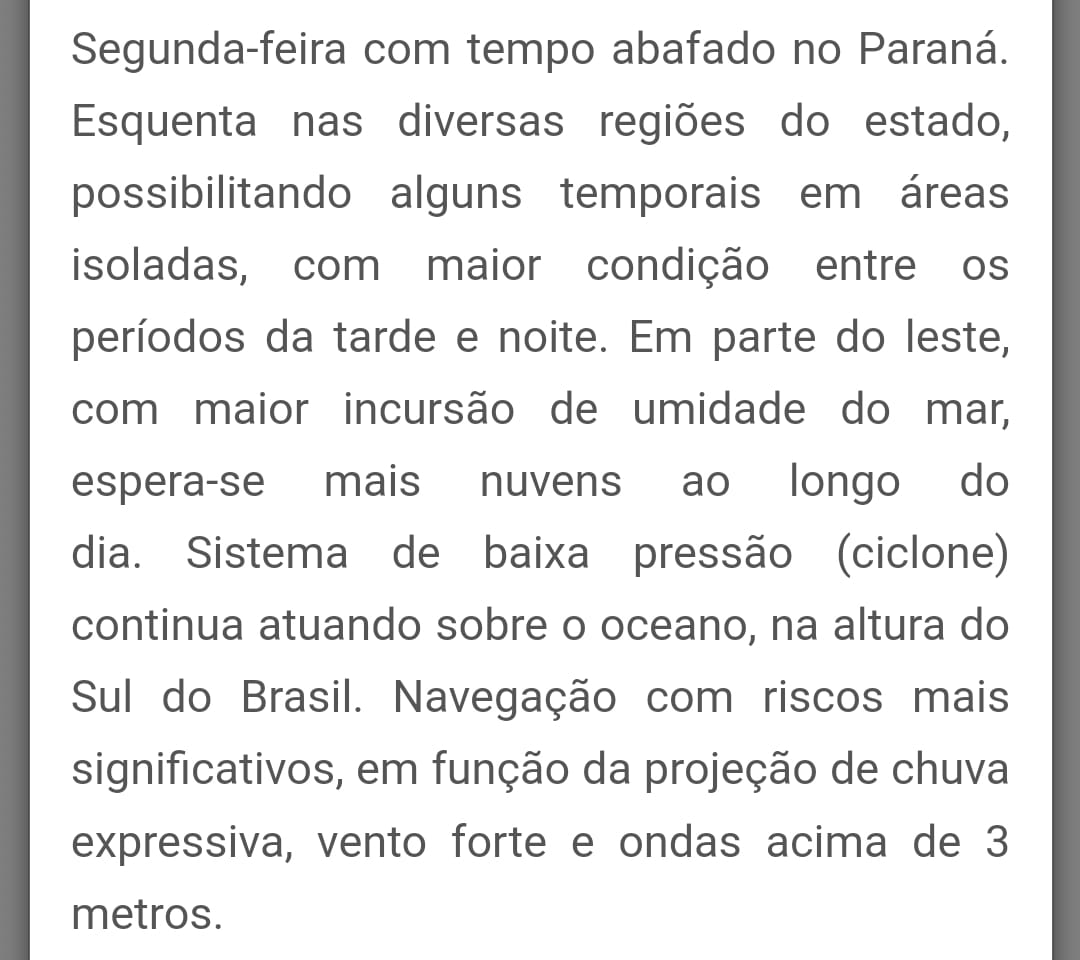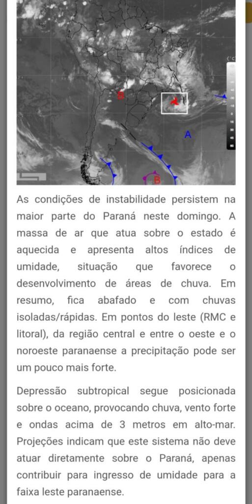 Conforme o Simepar, a massa de ar que atua sobre o Estado é aquecida e úmida, o que favorece o desenvolvimento de áreas de chuva e deve seguir assim durante esta semana, inclusive com possibilidade de temporais.