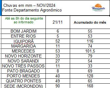 Na quinta-feira (21), a chuva chegou na parte da tarde e persistiu até início da noite, acumulando 90 milímetros em apenas um único dia. O volume registrado em Marechal Rondon liderou o ranking dos municípios entre a região. Mercedes ficou em segundo lugar, com um acúmulo de 53 milímetros, seguido de Iguiporã, que registrou 52 milímetros.