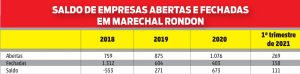 Mesmo diante de um cenário conturbado, Marechal Rondon conseguiu se destacar na abertura de empresas. “Nos três primeiros meses de 2021 tivemos a abertura de 269 empresas contra 158 que foram fechadas”, informa Portinho.