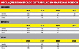 Nos últimos três anos, apenas em março de 2019 Marechal Rondon teve saldo negativo na geração de empregos, 153 postos de trabalho a menos (566 admissões e 689 demissões).