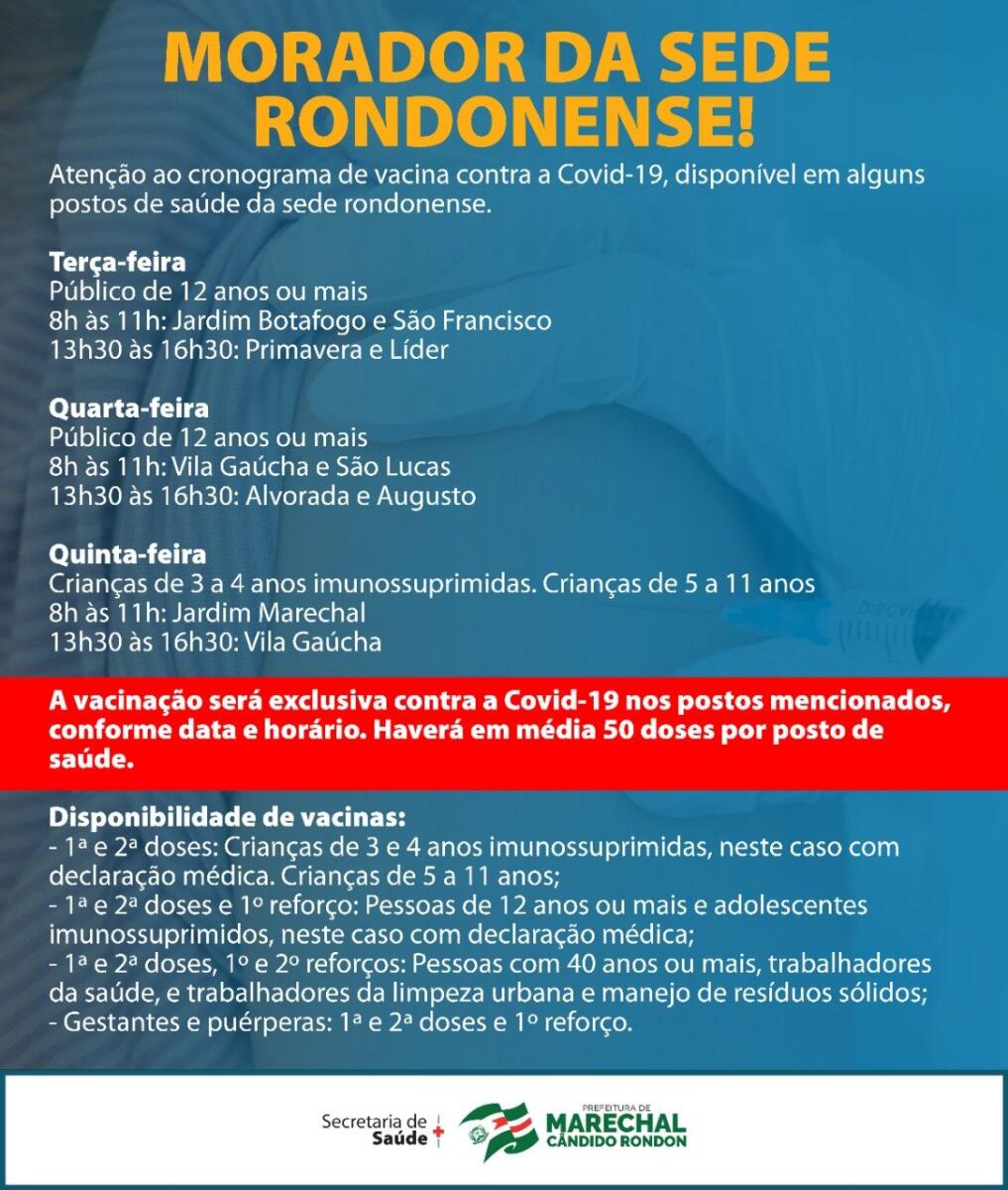 Nos referidos postos da sede e do interior, também há disponibilidade de vacinas para crianças de 5 a 11 anos. Vale ressaltar que a vacinação é exclusiva contra a Covid-19 nos locais supracitados, conforme data e horário.